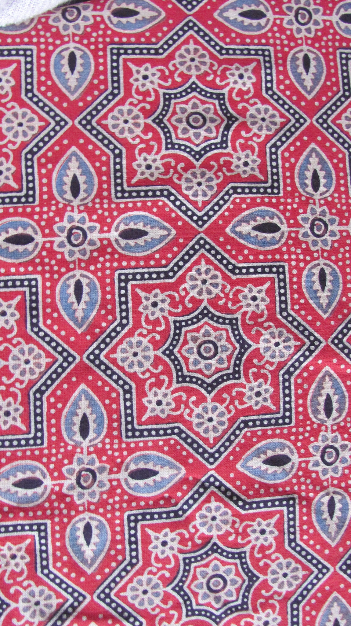 Ajrakh printing had its heyday in India in the 1700’s The king of Kutch recognized the textile art, and encouraged the migration of Khatris who were the printers The motives have remained the same since this period, flowers, leaves and stars being the most popular motives. The trefoil is said to represent the unity of Gods of earth water and sun