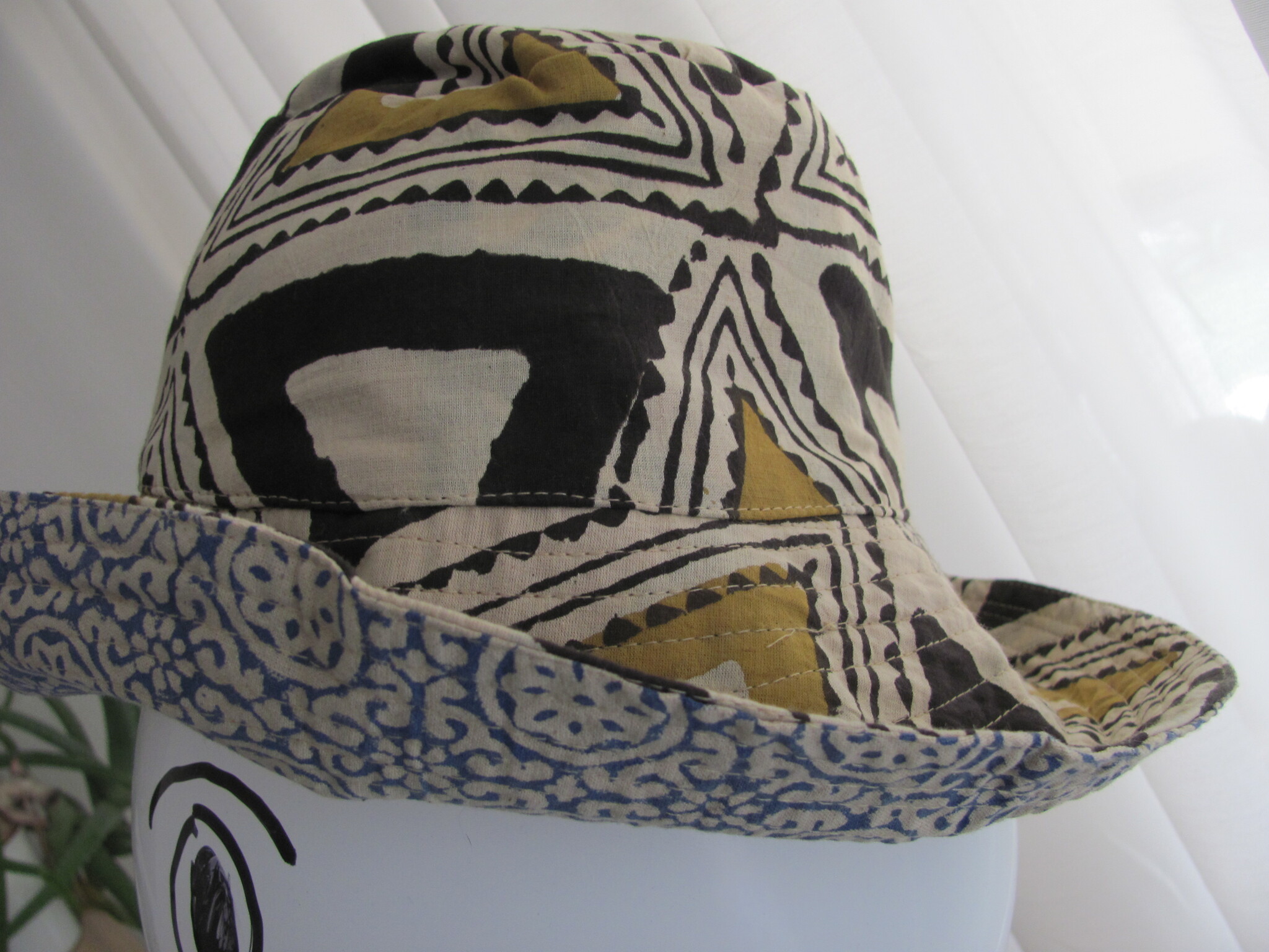 Bucket hat, reversible and hand printed using wooden blocks. The dyes used are all plant based and thus planet friendly. you can wash it with soap sud and line dry please.